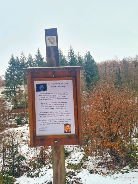 Auch sonst ist für Abwechslung gesorgt. Wir sind auf dem Poesiepfad – alle paar hundert Meter können wir uns von einem Gedicht inspirieren lassen. Die Lyrik wird viermal im Jahr neu kuratiert, lernen wir. Derzeit gibt es Rilke und Paula Modersohn-Becker. Hier die Ode an die blaue Hortensie. Dazu ein Hauch von Sonne und eine Ahnung von blauem Himmel.