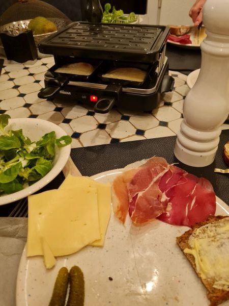 Back home. Nach dem Reste-Schnee jetzt noch ein Reste-Essen. Ein Paket Raclette-Käse nähert sich dem MHD, der Bresaola auch. Wir holen unser kleines Raclette raus, dazu gibt es frisches sauerländisches Brot, Gürkchen, Feldsalat, fertig. Wir mögen das gerne auf diese puristische und eigentlich typische Art und essen das im Winter öfter so als Abendbrot.