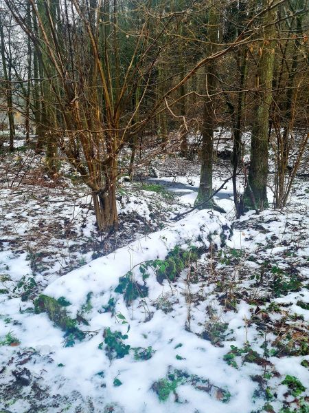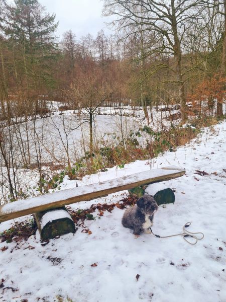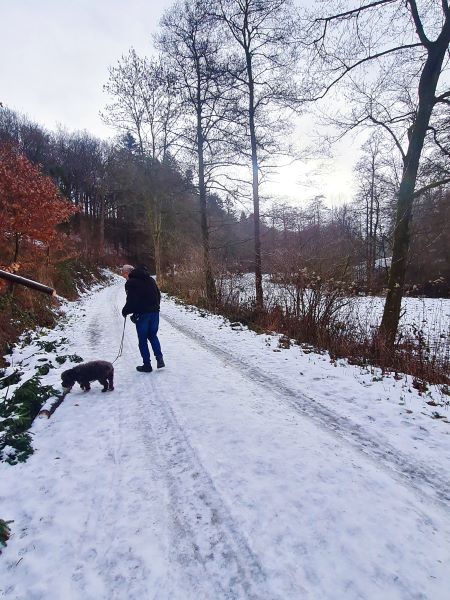 Wir sind im Mühlbachtal in der Nähe von Arnsberg. Von uns eine knappe Stunde entfernt. Außer uns sind nur wenige Menschen und Vierbeiner unterwegs. Es ist ein bißchen rutschig, aber nicht wirklich glatt. Dem Flusenbär reicht es nicht zum Wälzen im Schnee, aber er findet genug zum Schnuppern und freut sich über die Abwechslung.