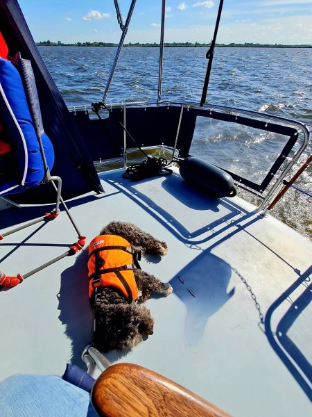 Ja, wir müssen den Flusenbär an Bord heben. Alternativ könnten wir eine Rampe besorgen. Aber spätestens bei der Leiter runter in die Kajüte müssen wir wieder heben. Er hilft da aber super mit. Mensch klettert als erstes die Leiter runter, stellt sich auf die erste Stufe, dann schlingt er einem die Vorderpfoten um den Hals und man kann ihn easy runterholen. Hochhieven geht etwas einfacher. Aber es ist super süß, wie er da mit macht. Viel größer dürfte er aber nicht sein.